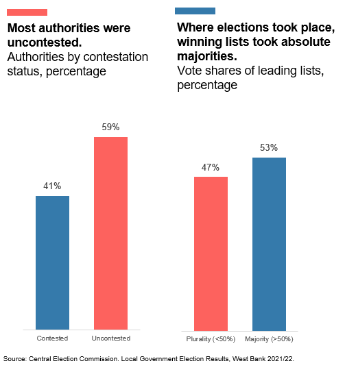 What’s reducing competition? One of the biggest drivers appears to be intimidation. The Bisan Center for Research and Development will shortly release a report that documents the use of violence and threats to reduce political competition. Bisan found that many potential candidates (particularly women and youth) and lists were effectively removed from contestation when they were made an offer they couldn’t refuse. Hamas officially boycotted these elections, which also likely reduced competition.