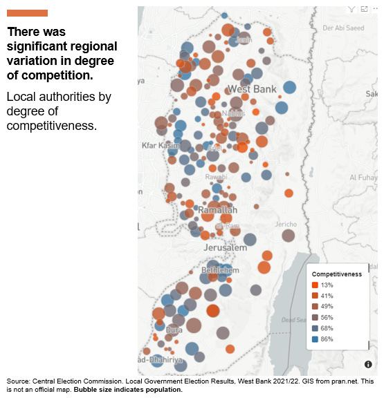 Competition varies pretty substantially across the West Bank and appears to be driven more by local dynamics with some highly-competitive regions northwest of Ramallah, and around Bethlehem.