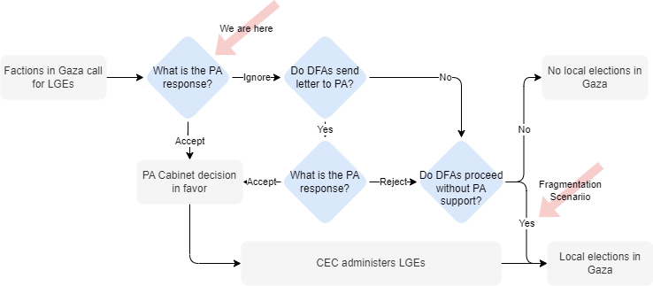 Gaza Local Elections. A few scenarios are solidifying around the Local Government Elections in Gaza (we’ve attempted to capture these in the chart below.) Analysts are increasingly concerned that if the PA (Fatah) and the de facto authorities in Gaza (DFAs) can’t reach an agreement, then it’s possible that the DFAs proceed without PA support. The DFAs have alluded to this possibility in meetings, and it’s been discussed in the media.
